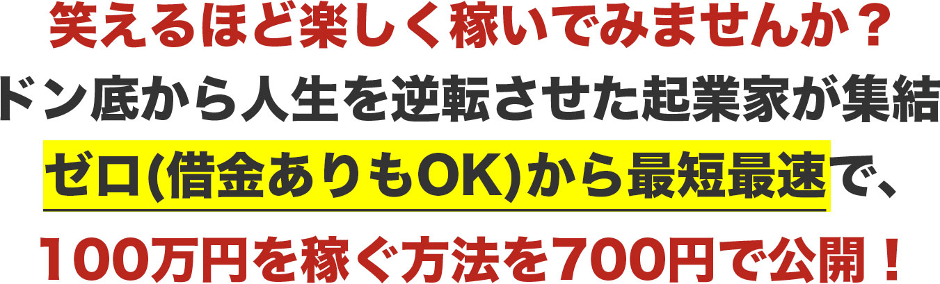 今回の出演者は、ドン底から人生を逆転した人ばかりです。ならば、「ゼロ(借金ありでもOK)から、100万円を稼ぐ具体的な方法」をゲスト全員に回答してもらい、あなたに、プレゼントすることにします。つまり、あなたは、ゼロから100万円を稼ぐ方法をゲストの人数分、つまり8通り知れます。その中の1つを実施すれば100万円、8つ全て実施すれば800万円です。また、最低100万円なので実際は青天井です。ゲストは多彩な顔ぶれですので、あなたに合う方法だけを選んでもOKです。